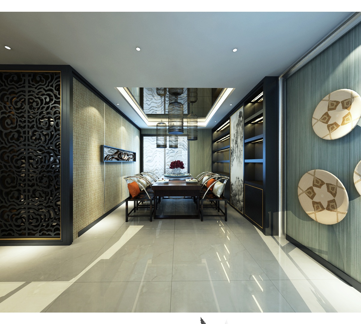 本套案例的设计采用中式和现代元素的结合,更加偏向现代风格,在客厅的活动空间内,中式家具来点缀整体的空间,用现代风格的电视墙及吊顶相呼应,造就了混搭风的美。