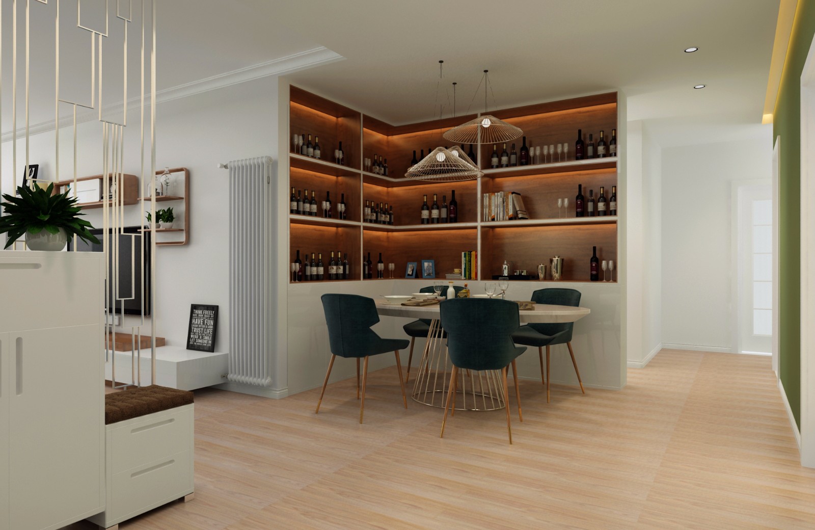 开放式的餐厅增大了空间感,酒柜的设计更加突出了餐厅的实用功能。圆角型的餐桌设计传达了舒适性,配合着镀铬的金属框架,制作成装饰艺术风格的标志性家具。