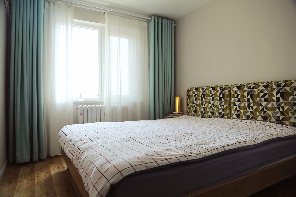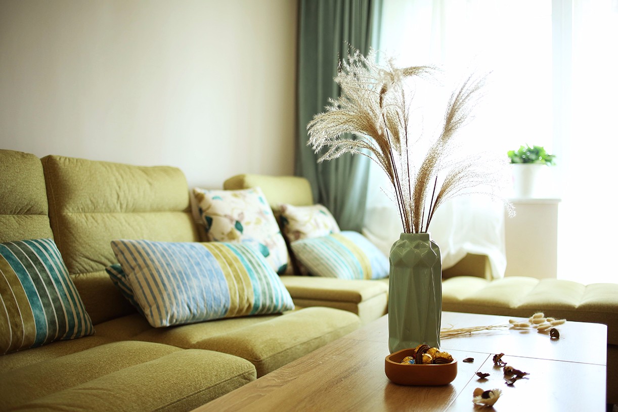 大面积的暖色里介入部分蓝绿,调和整体空间冷暖。